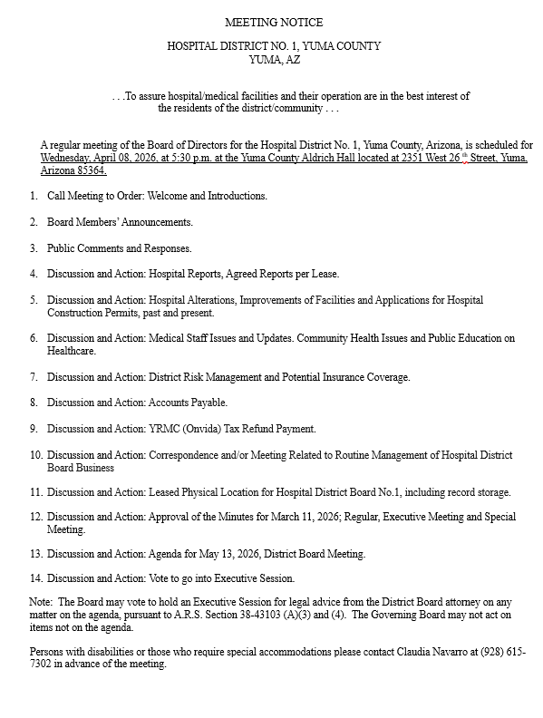 Yuma Hospital District #1 exists solely to benefit the greater Yuma community – a region that stretches from eastern California to the western Sonora desert with a hospital to care for people throughout region.